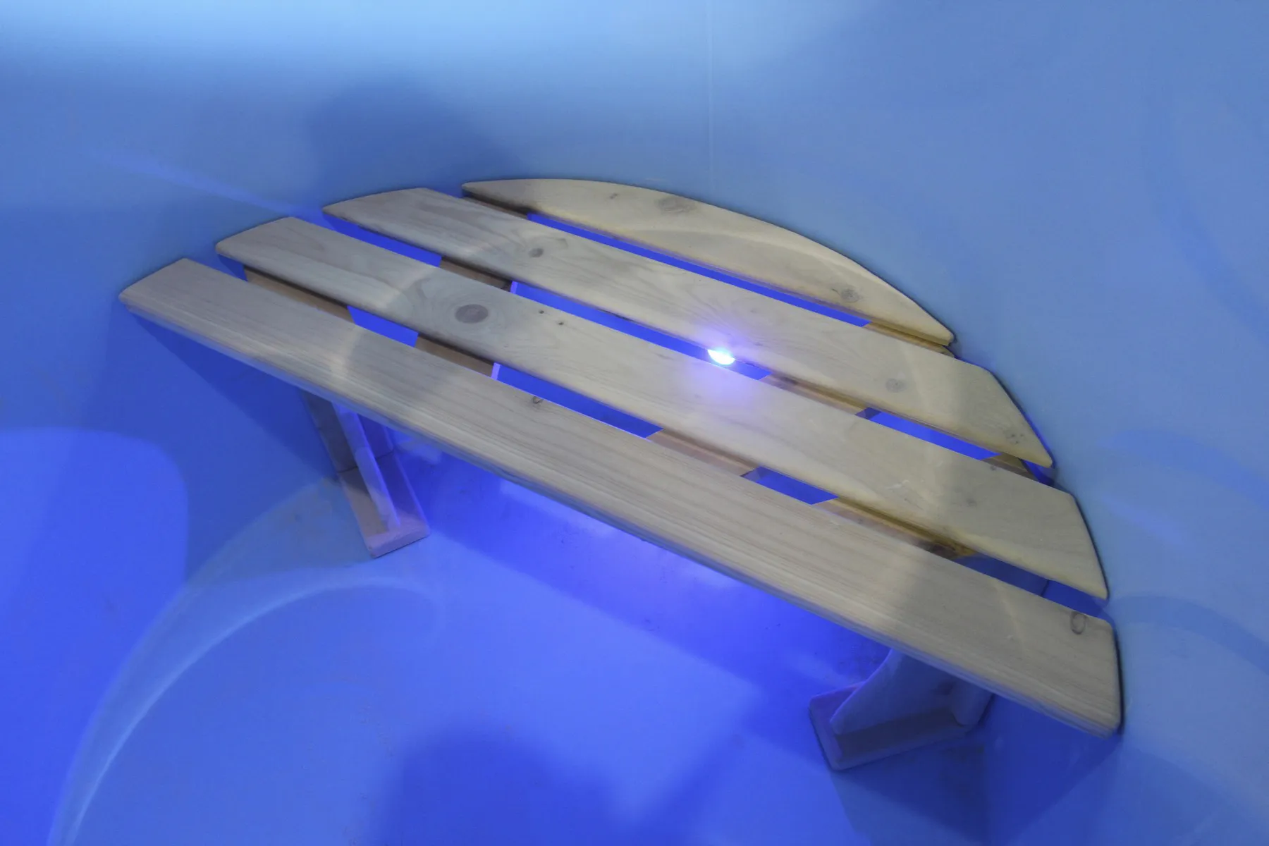 Светодиодные светильники 12В, встроенные в стенки купели, подсвечивают воду всеми цветами радуги.