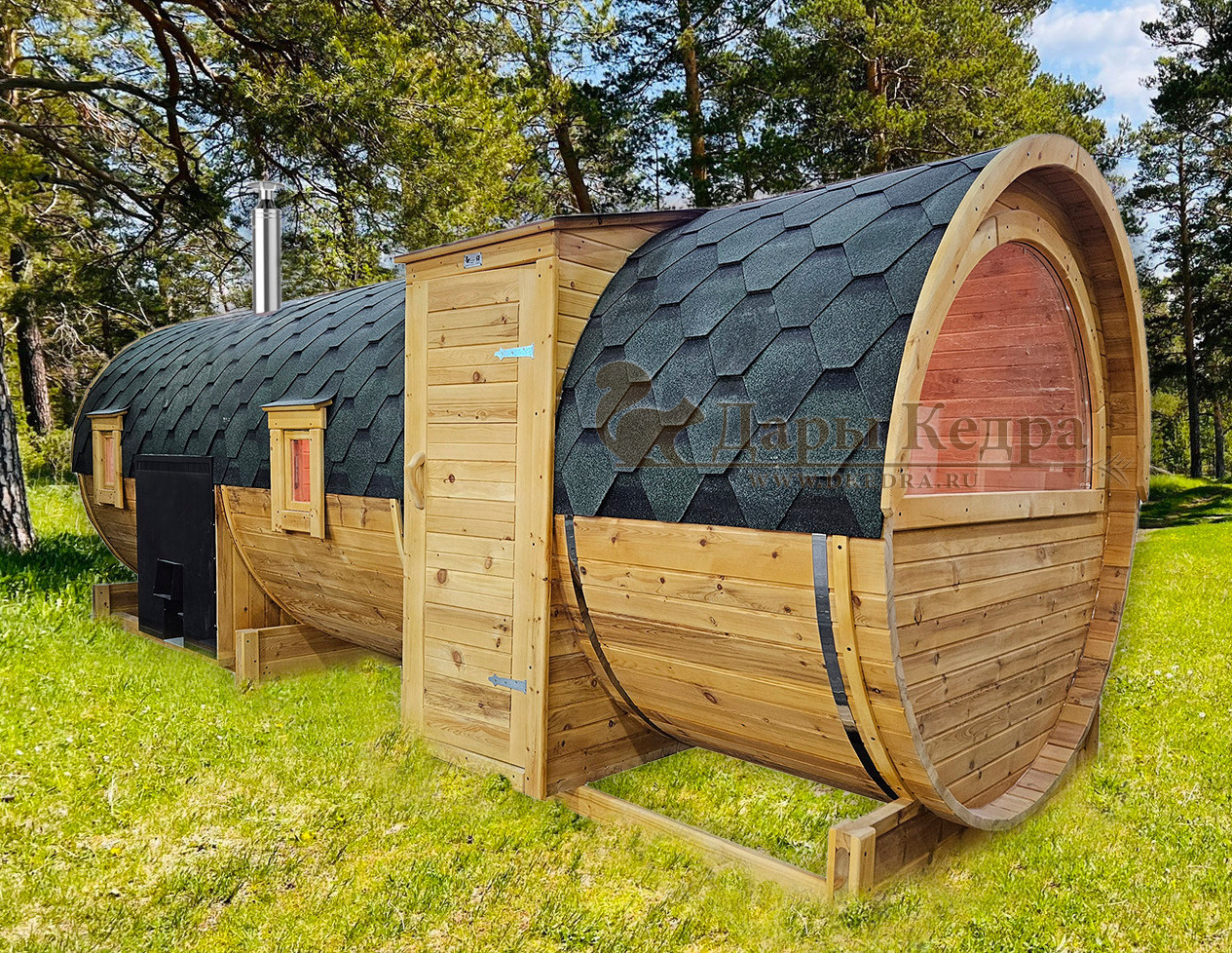 Нравится именно эта модель бани-буханки, просторная и парит хорошо! Мы заказывали с изменением цвета, смотрится достойно. Спасибо за консультацию специалистов компании Дары Кедра и за качественное изделие!