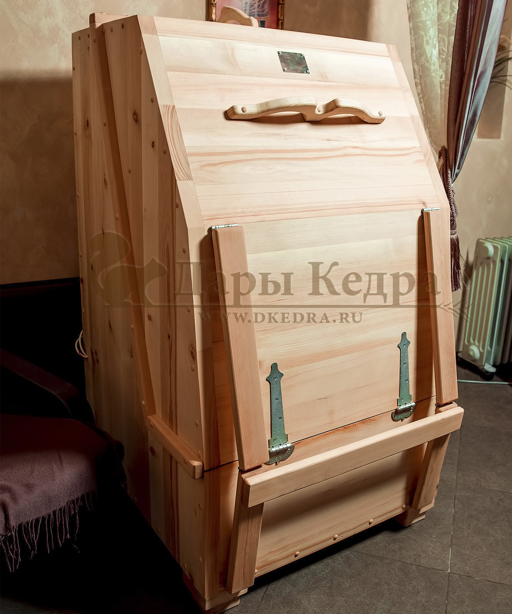 Квадратная фитобочка из кедра - это мини парная, которую можно использовать не только в спа-салонах, но и дома. Толщина стенок составляет 40-45 мм, что позволяет увеличить срок службы изделия. Откидная дверь бочки во время открывания фиксируется внешней подставкой - опорой, которая в закрытом состоянии складывается и не занимает лишнее пространство. Во время парения человек сидит внутри кедровой бочки, а голова находится снаружи. Благодаря этому исключается возможность перегрева. Встроенная ручка из кедра на двери делает эксплуатацию фитобочки более удобной.