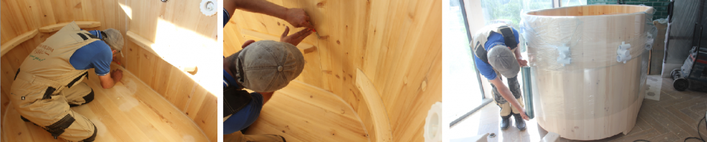 - Оставить купель до полного высыхания на 3 часа. После этого необходимо снять стяжные фиксирующие ремни и пленку. В местах склейки внутри и снаружи при необходимости убрать концелярским ножом остатки клея PUR, зашлифовать и нанести защитное покрытие, если изначально им была пропитана купель. И далее снова нанести пленку на изделие.